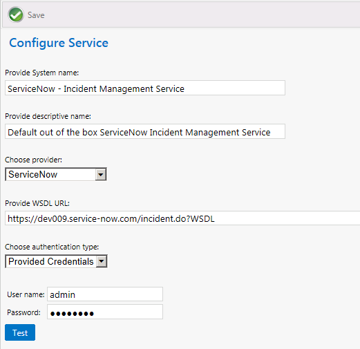 | Provide WSDL URL | Edit the URL to your instance of the ITSM system. Do not use any special characters in the URL field. The only special character that is permitted is _ (underscore). Dashes (-) and other special characters are not permitted. |