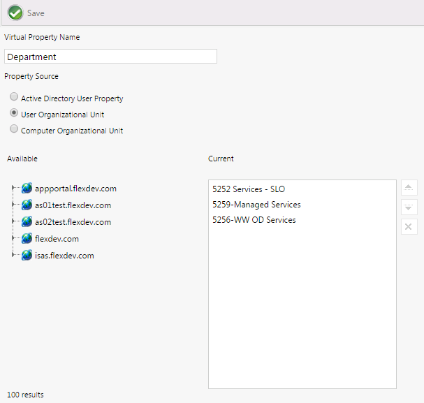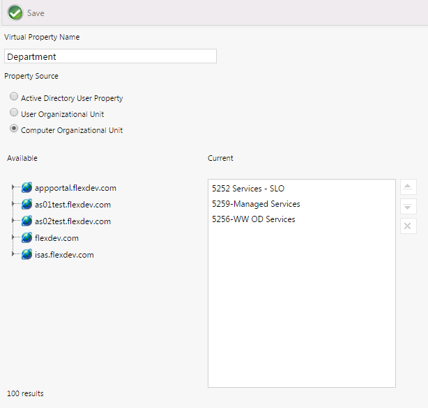 • Computer Organizational Unit —Select this option to extract values from a Computer Organizational Unit. When you select this option, a tree view of Organizational Unit s will be displayed in the Available area. Click and drag to move properties from the tree to the Current list.