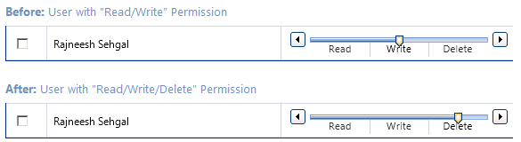 - On each of the tabs of the Admin Security view, adjust the user or group’s assigned rights for that role by sliding the indicator to select the desired rights, as shown in the following example: