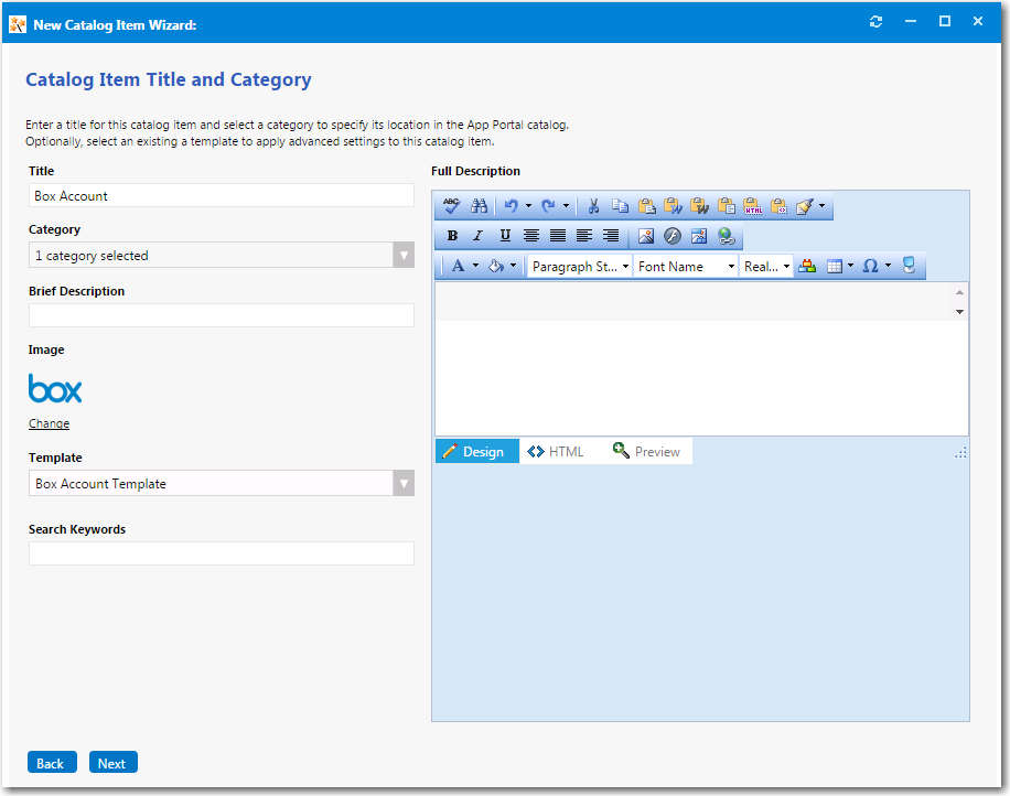 - Title—The text entered in the Title field along with the catalog item icon, will be displayed when viewing this catalog item on the Browse Catalog tab.
