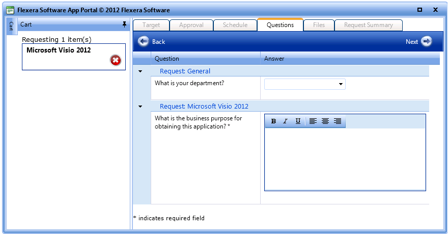 For example, in order to approve a software request, a manager may want to know the name of the project that the end user is working on that requires this application. Or, in order to determine licensing requirements, the manager may want to know how frequently the end user will use this application or the time of day that it would be used. The request will not be submitted until all required questions have been answered.
