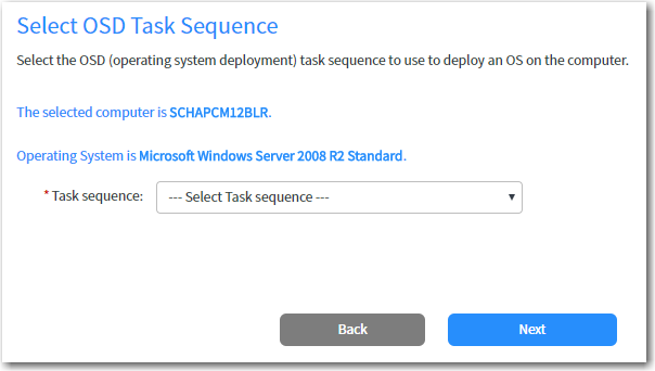 4. After you select a computer to update, click Next . The Select OSD Task Sequence or Select Non-OSD Task Sequence panel opens, listing the name of the selected computer and its current operating system.