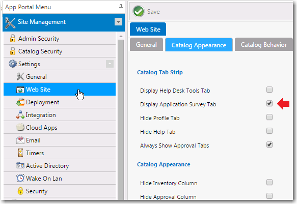 - Under Catalog Tab Strip , select Display Application Survey Tab .