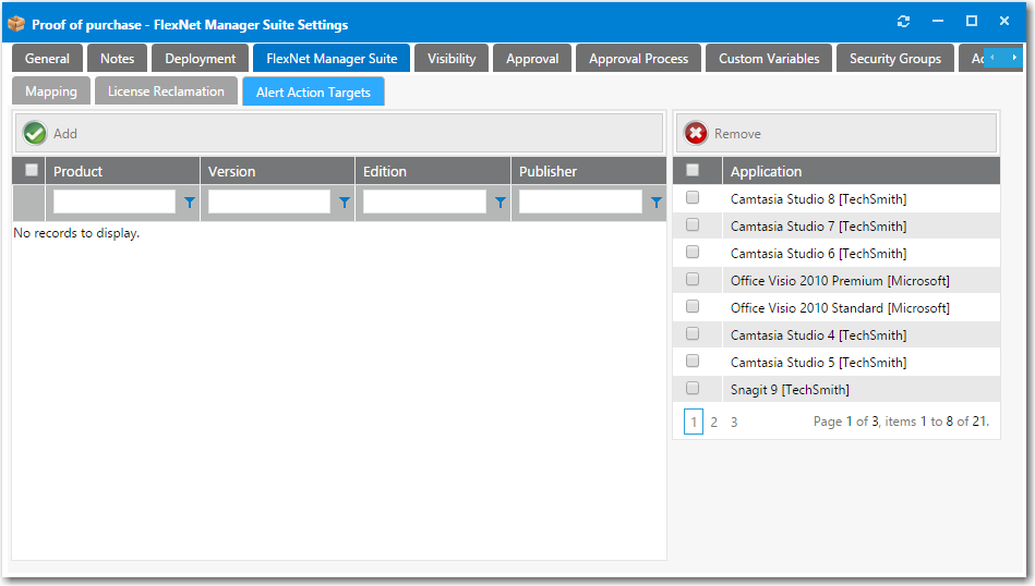 - Open the FlexNet Manager Suite > Alert Action Targets tab.