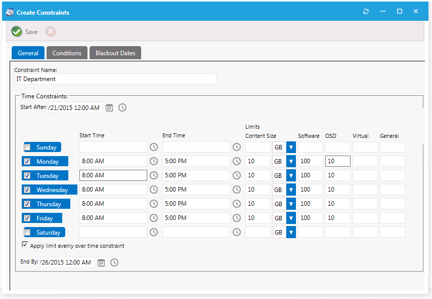 | Limits Content Size | To limit the scheduling based on the total content size for items being delivered for others that meet the same constraint, enter a limit (in KB, MB, or GB). This limit is calculated by totaling the SCCM package size for the requested items for that day. In this example, if 10 users scheduled Microsoft Office (a 1 GB package) from the IT Department on Tuesday, the next user would hit the content size limit for that day and would not be able to schedule their installation for Tuesday. If the requester selects Wednesday, the same evaluation will occur for that day. |