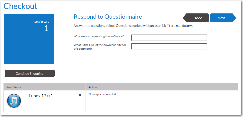If a question template is associated with one or more of the catalog items in the cart, the Respond to Questionnaire panel is displayed, prompting the user to answer questions. Questions are listed either at the top section or in the table below: